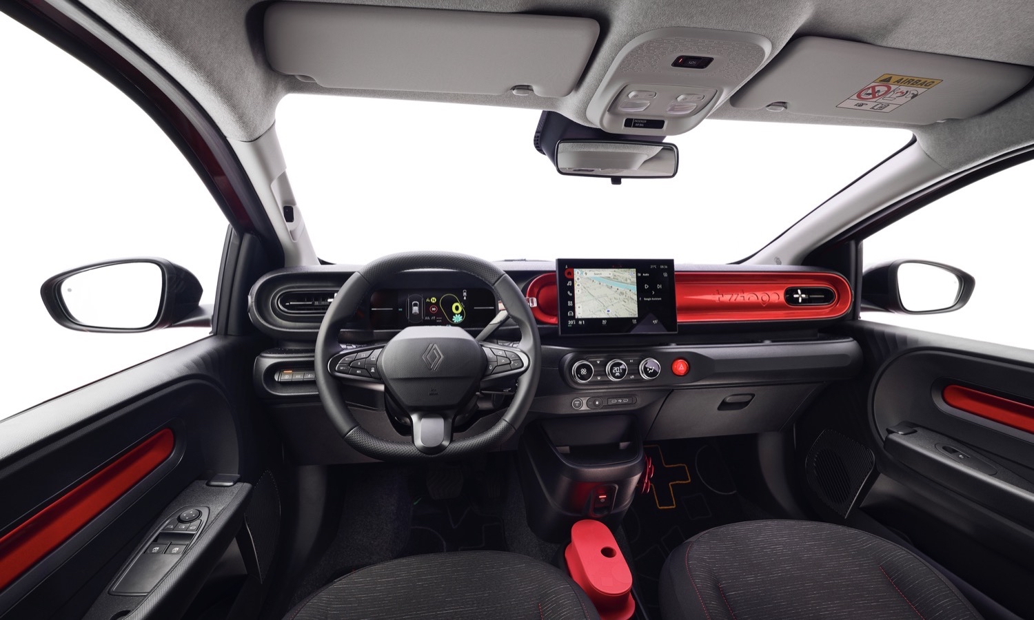 El habitáculo del nuevo Renault Twingo eléctrico se distingue por un diseño fresco y alegre que rompe con la monotonía de sus competidores. Aunque predominan los materiales sólidos, los ajustes son precisos y se enriquecen con molduras de colores vivos que combinan con la carrocería. Este coche urbano destaca por detalles únicos como el «alfabeto Twingo» en alfombrillas y techo, logrando una estética con personalidad propia que maximiza la sensación de luminosidad en todo momento.