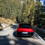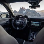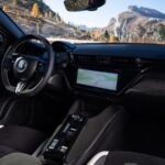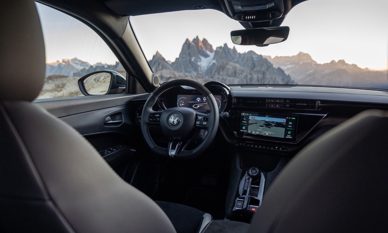 Puertas adentro, el protagonismo recae en los asientos calefactados con reglaje eléctrico y tapicería de Alcantara perforada, con inserciones claras y detalles «ice». El mismo material reviste salpicadero, túnel central y paneles de puerta, elevando la calidad percibida. El volante combina cuero y Alcantara con costuras de contraste, mientras que los pedales y la placa de umbral en aluminio, la iluminación ambiental y el logotipo iluminado del tablero refuerzan una atmósfera cuidada sin excesos.