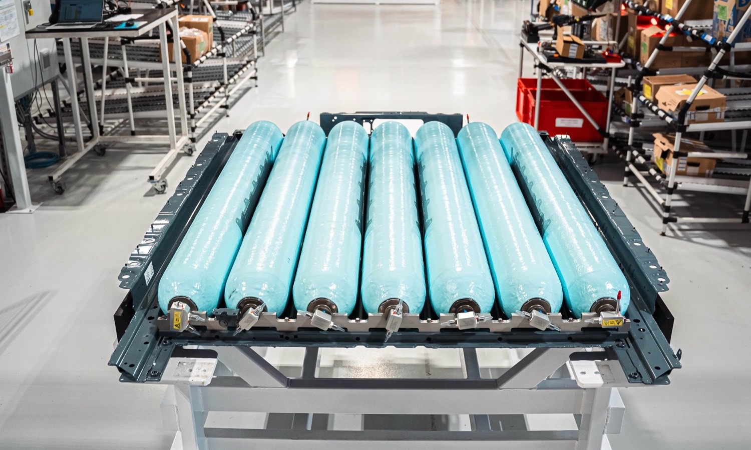 Este sistema está formado por siete cámaras alargadas de material compuesto reforzado con fibra de carbono, dispuestas en paralelo dentro de una estructura metálica robusta. Todas ellas conforman una única unidad cerrada gestionada por una válvula central, en lugar de funcionar como depósitos independientes conectados entre sí.