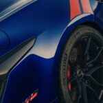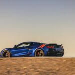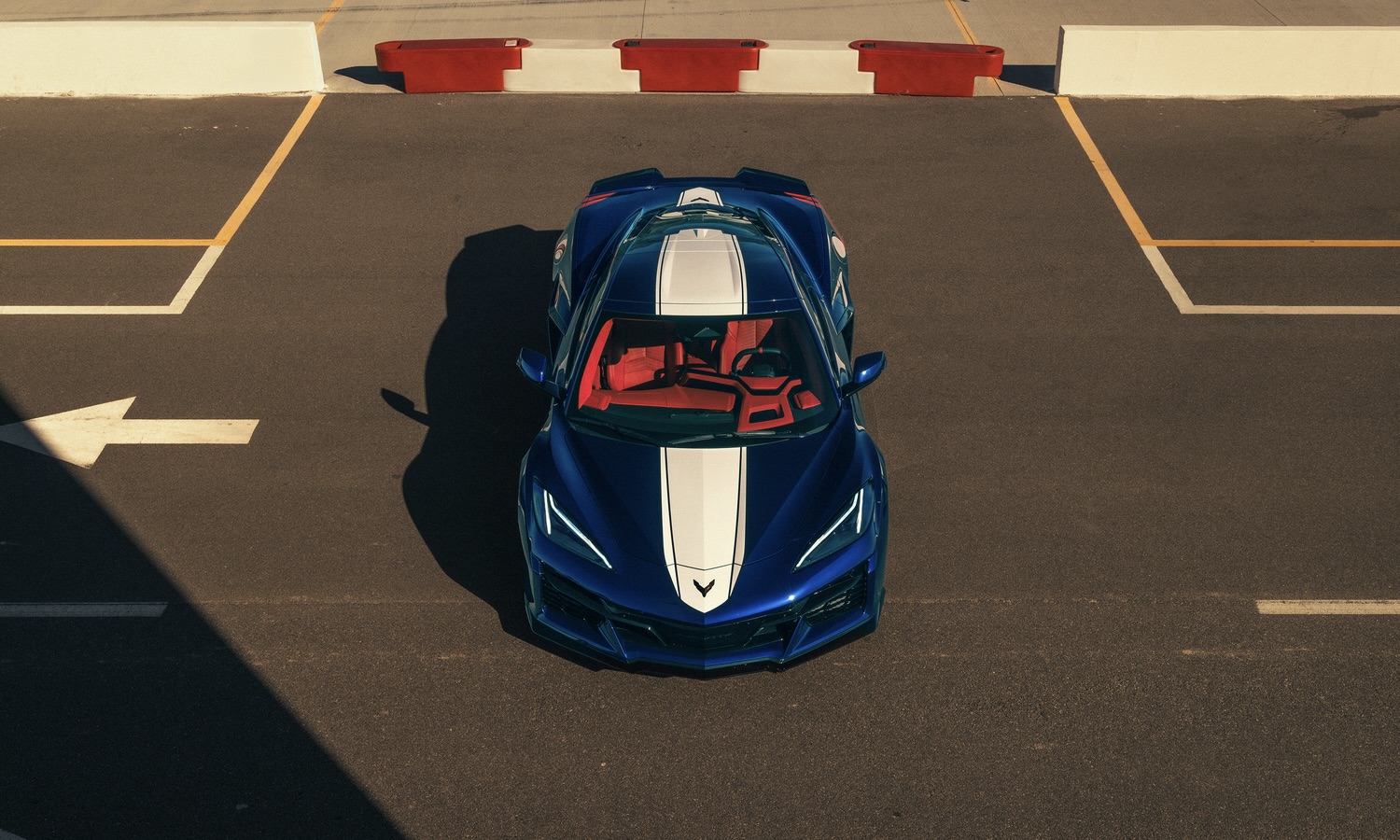 Las tradicionales marcas rojas tipo «hash marks» se recolocan: si en generaciones anteriores solían aparecer en la aleta delantera izquierda, ahora pasan a estar situadas en el lado contrario, en la aleta trasera derecha. A ello se suma una carrocería ensanchada de estilo widebody, muy similar en proporciones a la del Corvette E-Ray, con pasos de rueda más voluminosos y llantas de mayor anchura que evidencian el enfoque de rendimiento.