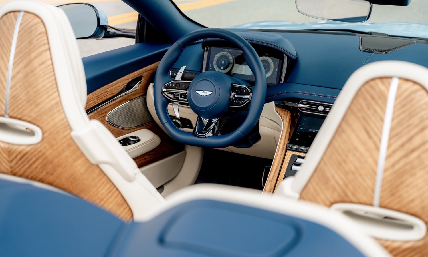 En el interior equipa asientos Comfort calefactables con ajuste eléctrico de 12 vías, volante con regulación eléctrica, iluminación ambiental, reposabrazos central y acabados de alta calidad con umbrales firmados. En conectividad, incorpora doble pantalla TFT de 10,25” (cuadro e infotainment) con sistema propio compatible con Apple CarPlay Ultra, Android Auto, control por voz, Bluetooth, radio digital, navegación integrada y servicios conectados con actualizaciones OTA y llamada SOS según mercado. De serie incluye equipo de audio Aston Martin de 11 altavoces y 390 W.