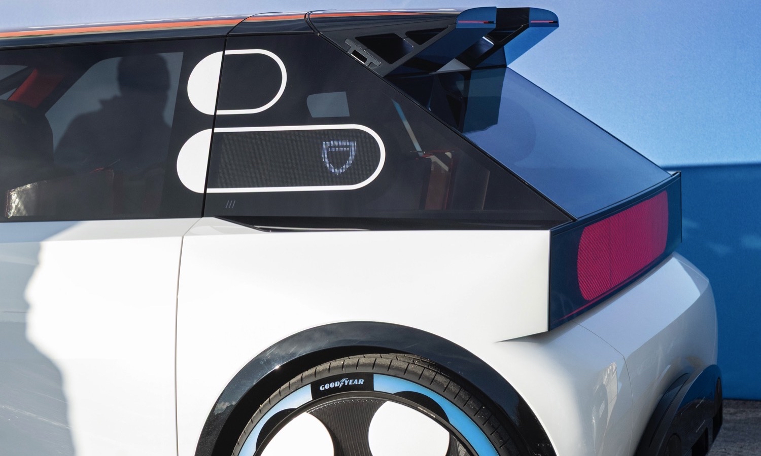En la parte trasera, un panel luminoso puede transmitir información a otros usuarios de la vía. Esta solución anticipa futuras funciones de comunicación vehículo a vehículo y con peatones. También se apoya en neumáticos desarrollados con Goodyear, con tecnología láser en los flancos. Permiten grabar colores y adaptar rápidamente la apariencia exterior. Este detalle refuerza la idea de personalización y diseño modular.