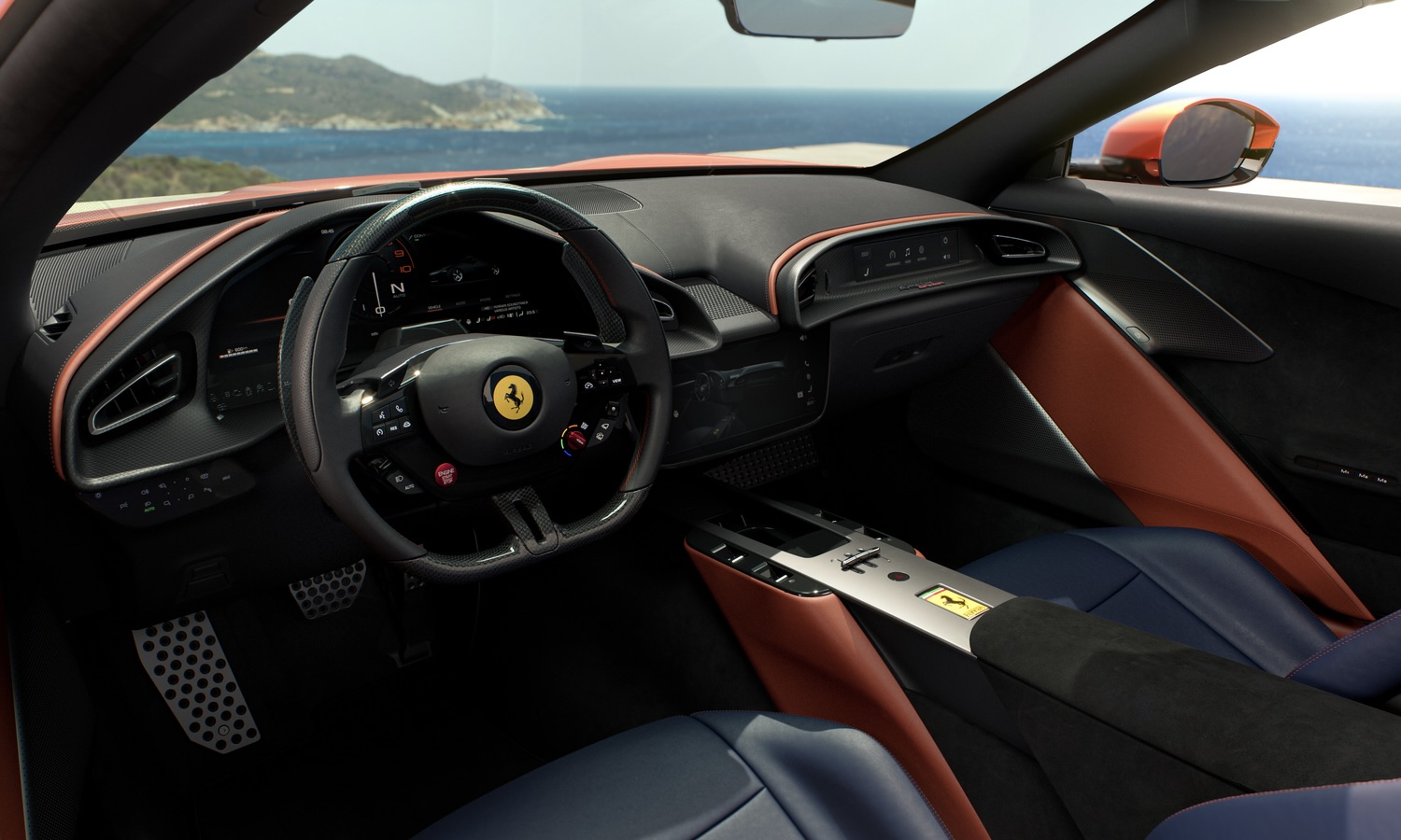 El habitáculo del Ferrari Amalfi Spider destaca por su arquitectura de doble cabina, que separa claramente los espacios del conductor y el acompañante. La consola central, fabricada en aluminio mecanizado, presenta un diseño de puente suspendido donde se agrupan los controles de la transmisión. Este coche deportivo apuesta por un estilo minimalista en su salpicadero monolÃtico, complementado con paneles de puertas inspirados en la náutica. La calidad superior se refleja en sus tapicerÃas de alta gama, permitiendo una personalización total en pieles e inserciones para los clientes más exigentes que buscan exclusividad.