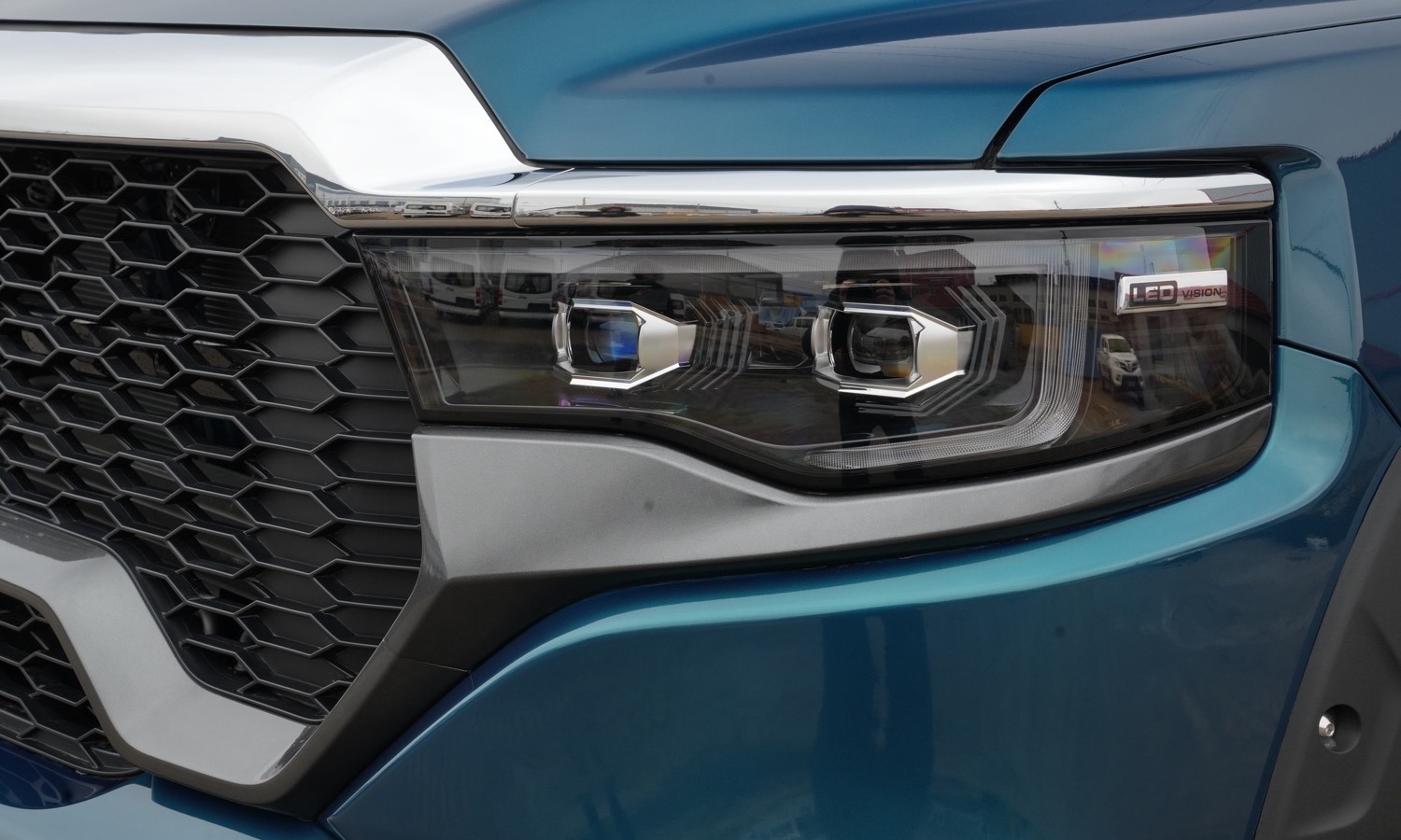 Estéticamente, el V9 apuesta por una imagen poderosa y llamativa. El frontal está presidido por una enorme parrilla en negro, faros Full LED y un conjunto que recuerda inevitablemente a algunos modelos norteamericanos, especialmente en la forma de la firma luminosa trasera, muy al estilo de la Ford F‑150 moderna. Las llantas de 18 pulgadas, los estribos laterales y las barras en el techo refuerzan esa imagen de pick‑up recreacional con aspiraciones premium.