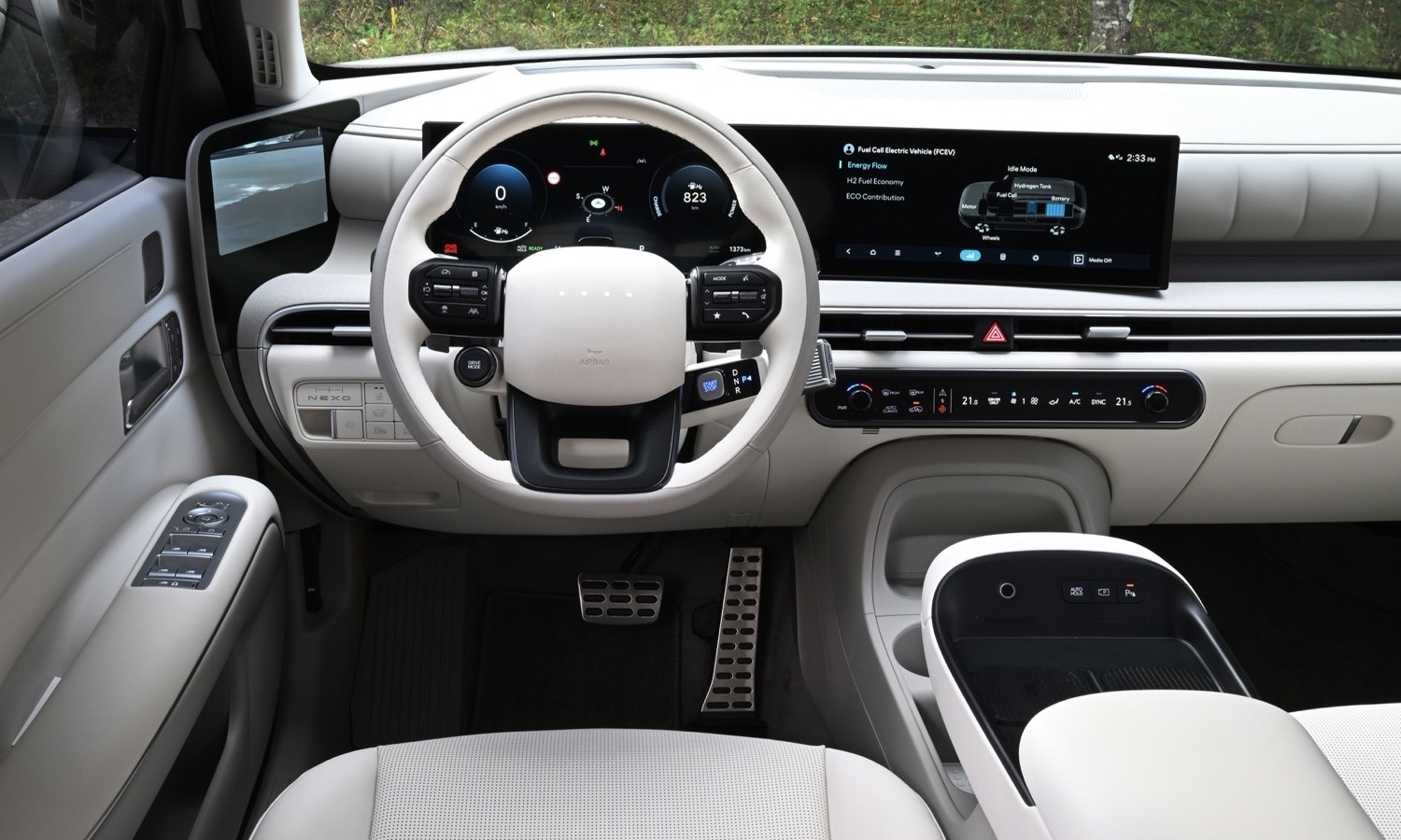 El sistema de infoentretenimiento integra navegador conectado, servicios en línea y distintas funciones específicas para gestionar datos del sistema de hidrógeno, como consumo, autonomía o funcionamiento de la pila de combustible. Todo esto se presenta en la doble pantalla curva, que concentra buena parte de la información relevante de conducción y entretenimiento.