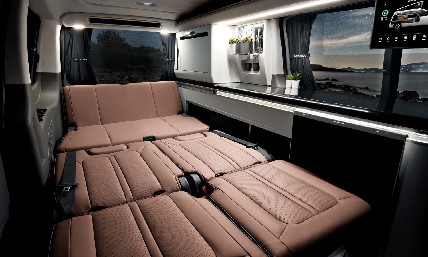 Por dentro, el Staria Camper Concept se ha planteado como un espacio modulable, donde los asientos dejan de ser un simple mobiliario de viaje para convertirse en muebles de salón y cama. En la parte delantera se mantienen dos asientos individuales tipo butaca, que pueden girar electrónicamente 180 grados para formar una zona de estar en combinación con la parte trasera.