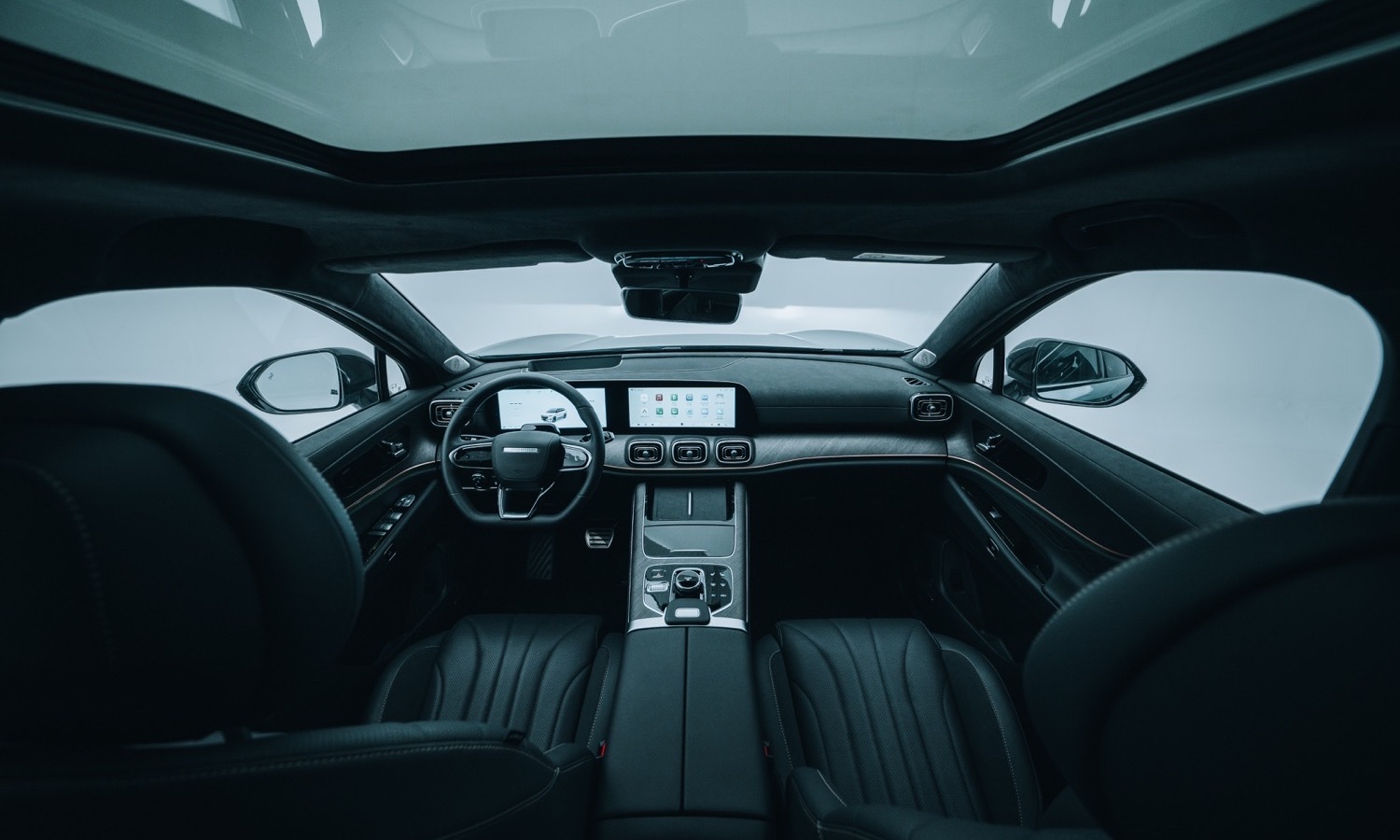 Los paneles de puerta siguen la misma filosofía, con superficies blandas al tacto y una malla 3D decorativa. El techo puede ir tapizado en un material tipo Alcantara, lo que refuerza ese aire más cercano a los estándares de las marcas tradicionales de gama alta. Además, el modelo monta un gran techo solar panorámico que abarca buena parte del habitáculo y aporta luz a todas las filas.