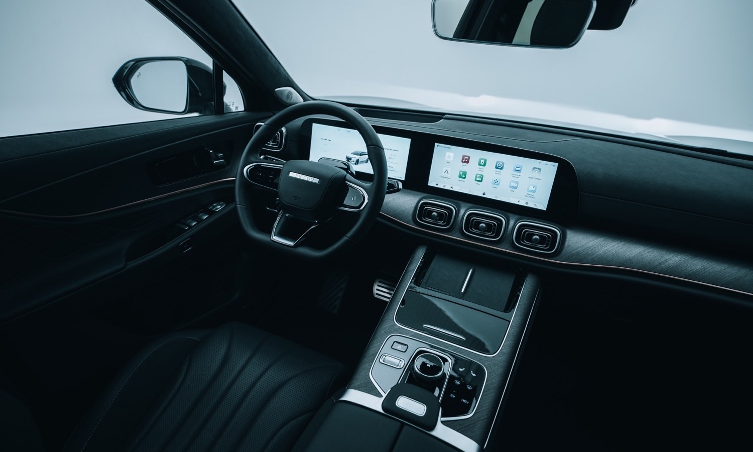 Dentro, el JAECOO 8 SHS apuesta por un salpicadero dominado por dos pantallas panorámicas de 12,3 pulgadas, una destinada a la instrumentación digital y otra al sistema multimedia. Estas se integran en un mismo módulo, mientras que la parte media del tablero recurre a materiales acolchados, costuras vistas y una franja con textura que recuerda a la madera, con el objetivo de elevar la percepción de calidad.