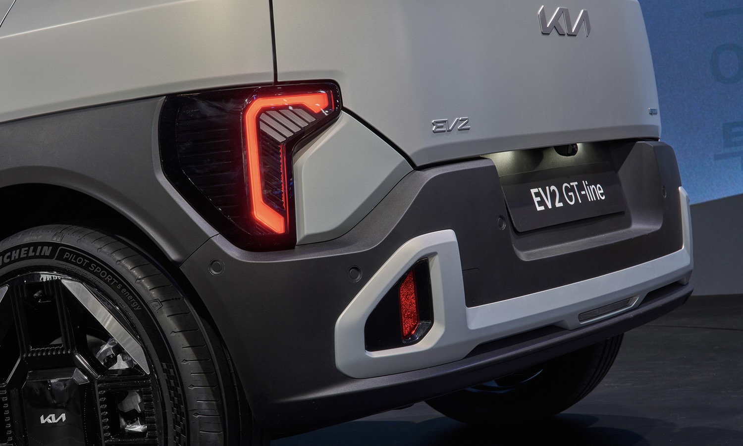 Visualmente, el Kia EV2 adopta la filosofía de diseño “Opposites United”, ya vista en otros modelos de la familia eléctrica. El coche presenta formas cúbicas, voladizos muy cortos y una cintura alta, lo que refuerza la sensación de solidez pese a sus dimensiones reducidas. El frontal prescinde de parrilla tradicional y apuesta por un aspecto limpio, con una superficie principal cerrada y las tomas de aire situadas en la parte baja del paragolpes.