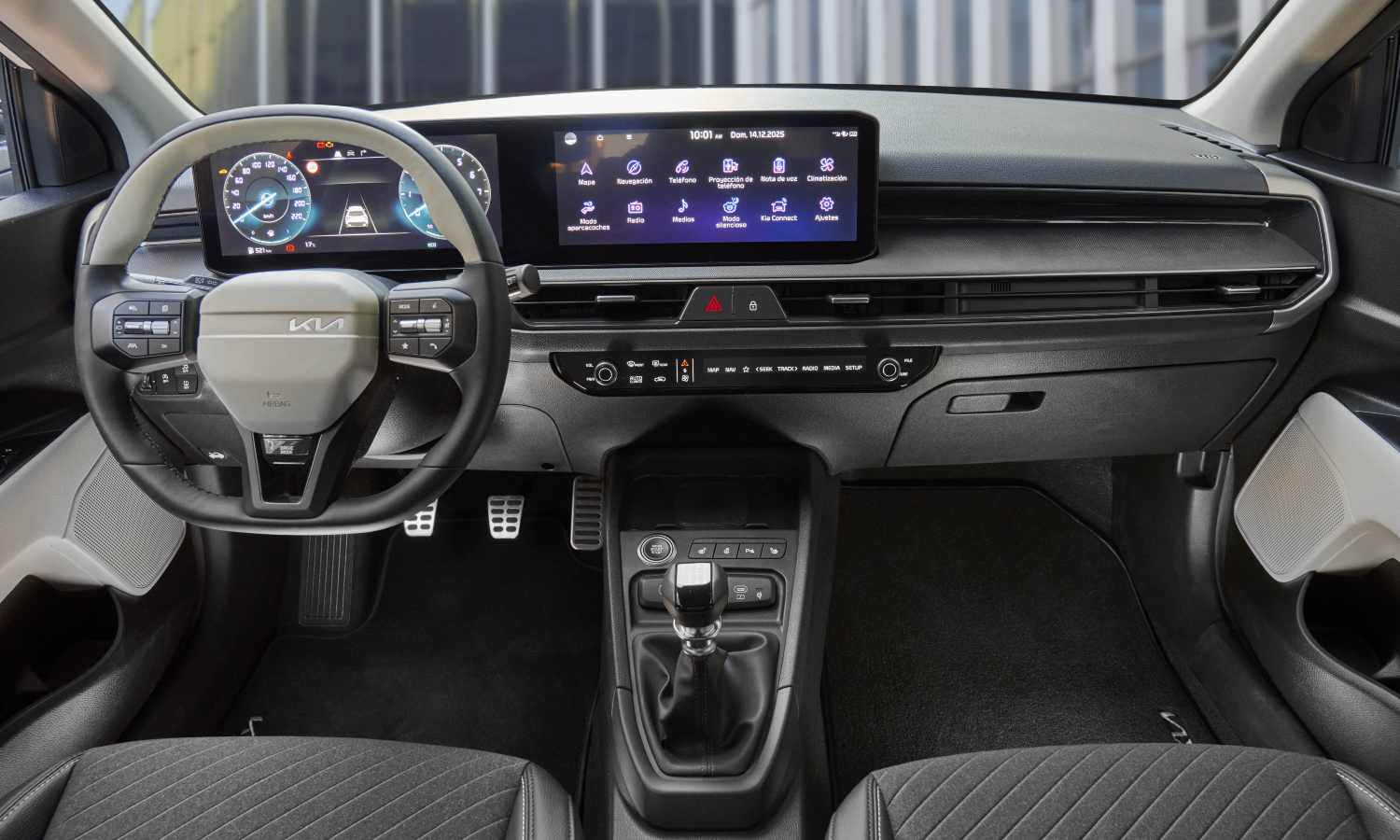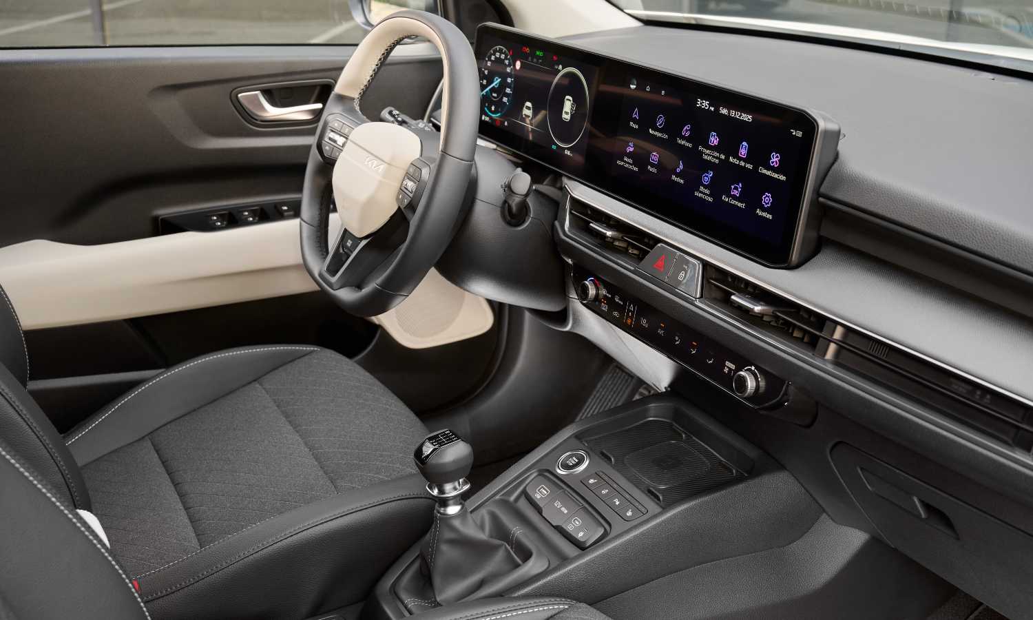 Donde el Stonic da un salto verdaderamente notable es en el interior. Kia ha reformulado el habitáculo para acercarlo al nivel de modelos mayores de la marca, tanto en tecnología como en percepción de calidad. El elemento estrella es la nueva configuración panorámica de doble pantalla de 12,3 pulgadas, que integra en un único conjunto la instrumentación digital y el sistema de infoentretenimiento.