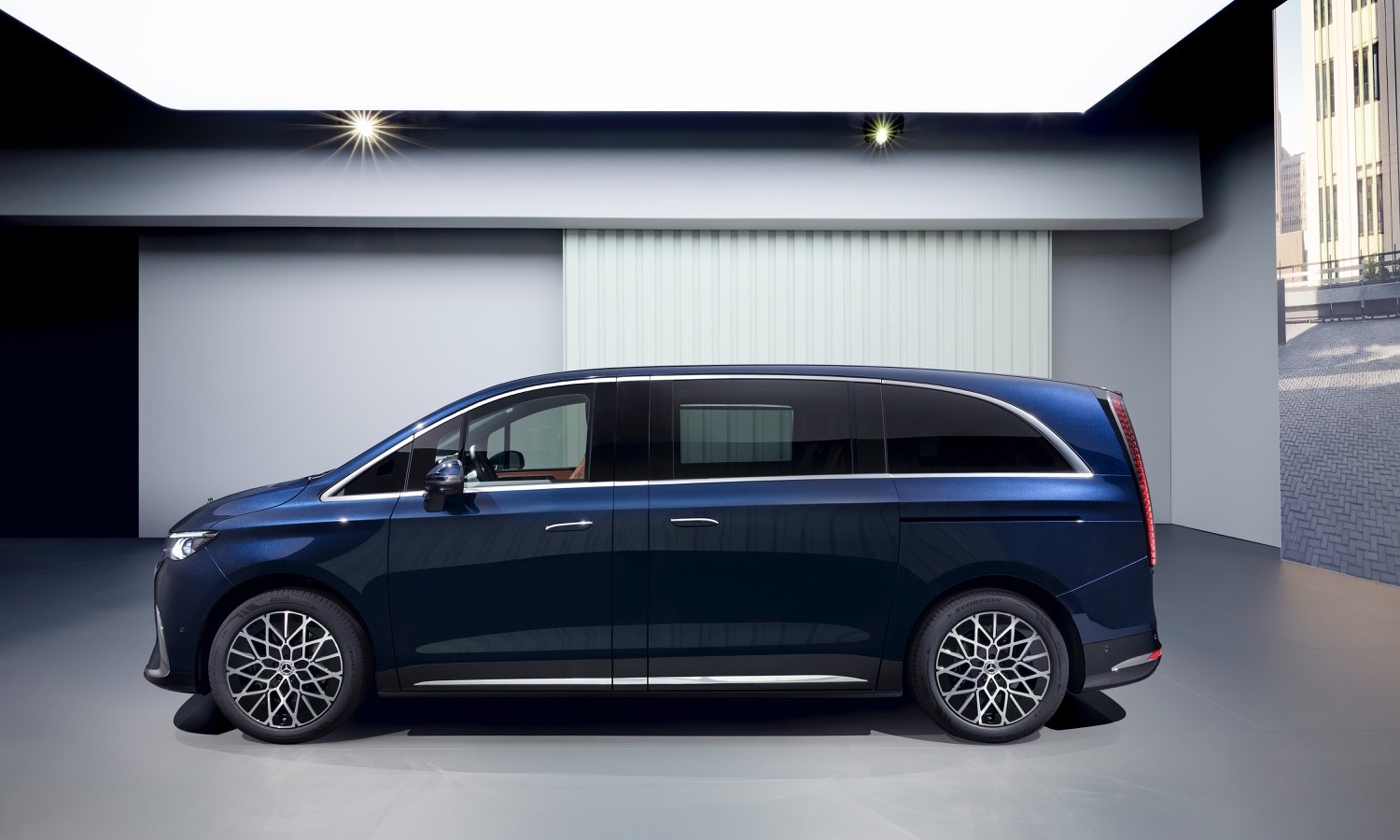 La vista lateral muestra una amplia superficie acristalada con el caracterĂstico diseño en forma de media luna, rematada por una gran luneta posterior. En la zaga, la firma lumĂnica adopta un diseño estilizado con un trazado en U invertida. Las llantas de aleaciĂłn pueden alcanzar hasta 22 pulgadas, con diseños que recuerdan a los modelos más lujosos de la gama Mercedes-Maybach, reforzando la imagen de monovolumen de representaciĂłn.