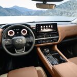 Dentro, el salpicadero se actualiza con un formato más limpio e integra una inscripción PATHFINDER bajo la pantalla central. Los tapizados cambian de patrón y aparecen detalles tipo madera en los acabados superiores, elevando la percepción de calidad sin demasiadas florituras.