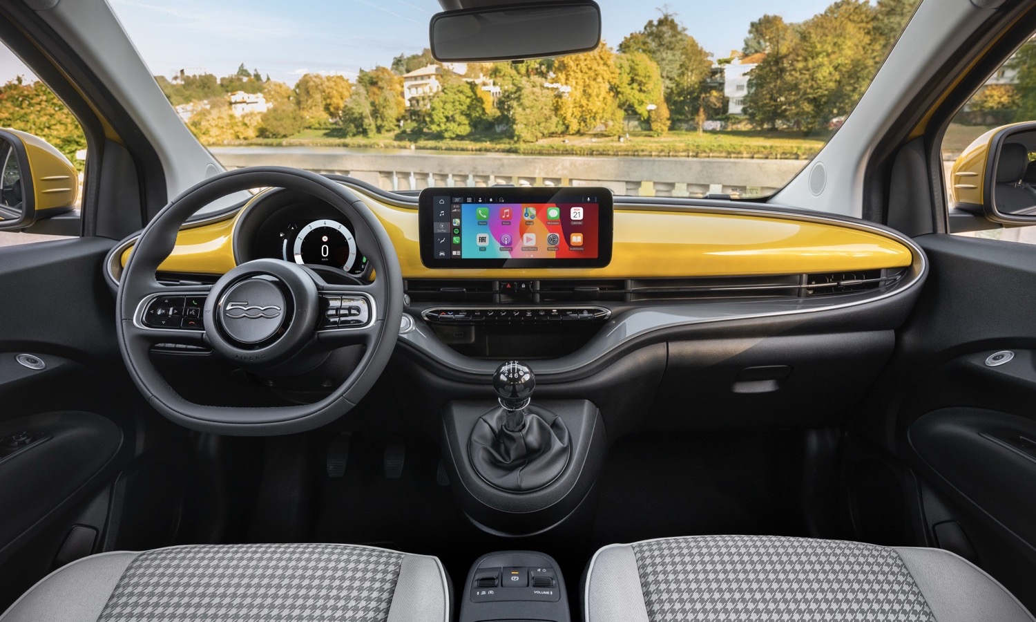 El interior del 500 Hybrid replica el diseño del 500e con un salpicadero horizontal personalizable según acabado. La Prima incorpora terminaciones perladas, mientras que Torino añade tapicerías exclusivas y detalles decorativos diferenciadores. El espacio delantero es adecuado para adultos, y las plazas traseras resultan prácticas para trayectos breves o niños, en línea con su vocación urbana.