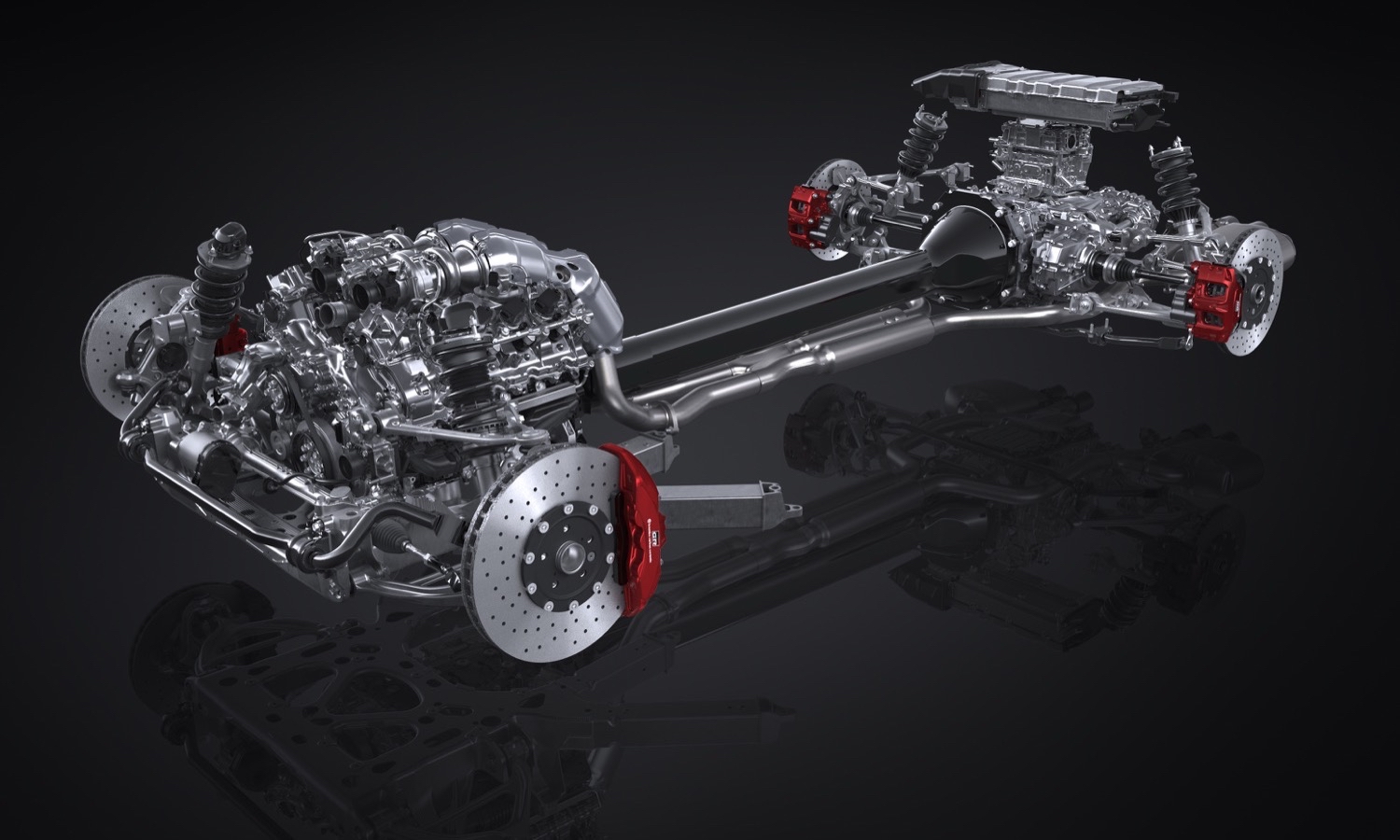 El GR GT emplea una arquitectura clásica en los deportivos más puros: motor delantero y tracción trasera, pero con una realización muy elaborada. La potencia del V8 se transmite hacia la parte posterior mediante un árbol de transmisión de material compuesto con refuerzo de fibra de carbono, alojado dentro de un tubo de par ultraligero, hasta llegar a la unidad transaxle.