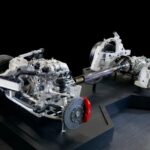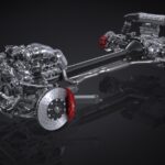 En ese transeje se integran una nueva caja de cambios automática de ocho relaciones con embrague húmedo, un diferencial de deslizamiento limitado mecánico y el propio motor-generador eléctrico. Esta disposición desplaza peso hacia atrás y ayuda a alcanzar el reparto de masas 45:55. Además, el motor eléctrico tiene la función añadida de suavizar el retraso de los turbocompresores y mejorar la continuidad en las transiciones de par durante los cambios de marcha, algo especialmente apreciable cuando se rueda a ritmo alto en circuito.