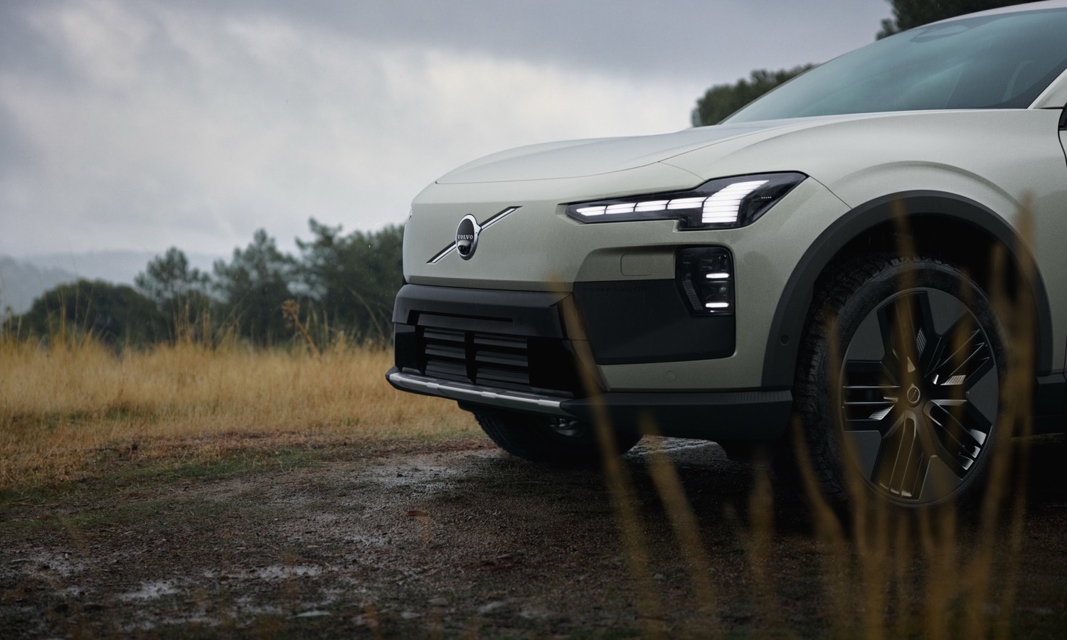 Frente al EX60 estándar, el Cross Country suma pasos de rueda ensanchados, molduras negras en la parte baja de las puertas, protecciones metálicas visibles en los paragolpes y un color específico de carrocería, un tono verdoso conocido como «Verde Escarcha». La altura libre al suelo crece en unos 20 mm gracias a una suspensión neumática de serie, que permite además elevar la carrocería otros 20 mm adicionales en modos específicos para pistas o caminos. A alta velocidad, el sistema baja automáticamente el coche para reducir consumo y mejorar la estabilidad. Todo ello supone apenas unos 20 kilos extra de peso frente a un EX60 equivalente con la misma mecánica, un incremento moderado teniendo en cuenta el equipamiento añadido.